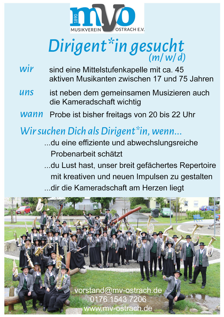 Wenn aber Du Interesse hast an einer neuen Herausforderung, und etwas Geschick am Dirigentenpult, dann bewirb Dich doch um ein Probedirigat bei uns.